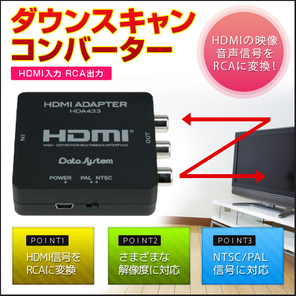 ●HDMI信号をRCAに変換 ●さまざまな解像度に対応 ●NTSC/PAL信号に対応 ※使用するには別売りのUSB-ACアダプターが必要になります。 |