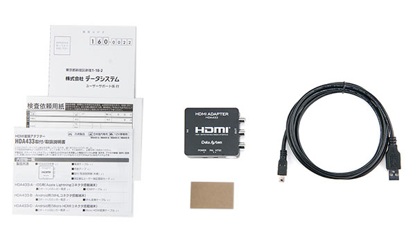 ![]() HDA433本体/電源ケーブル/両面テープ/取り付け・取り扱い説明書/保証書 |