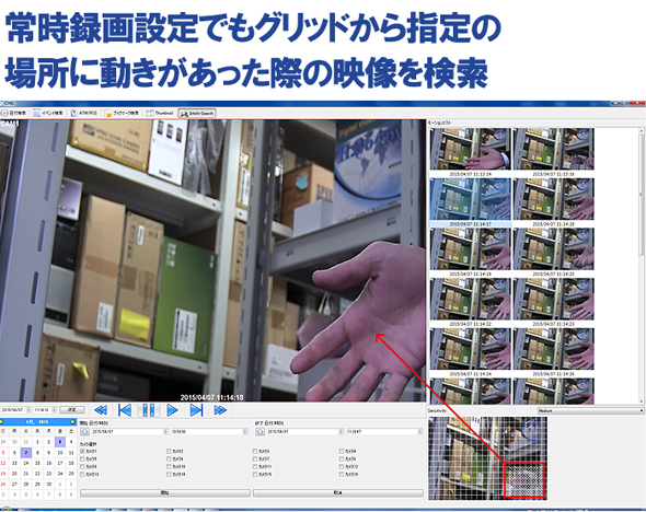 ![]() ■従来のアナログカメラも接続することが出来るハイブリット方式 220万画素のAHD、CVBS(アナログ)方式のカメラに対応。既存のシステムにハイビジョンカメラの増設や既存のシステムをそのままハイビジョン化ができます。 ・AHD 200万画素(FHD)、130万画素(HD)、 アナログ 52万画素に対応したハイブリッドレコーダー。 ・256ch同時監視、EMAP機能などの高機能CMSソフト等多彩な機能を搭載。 ・指定した場所で変化があったことを簡単にサーチできるインテリサーチ機能搭載。 ・exeバックアップでシンプルかつ利便性が高いバックアップが可能。 ・ファンレスの静音設計。 ■さまざまな解像度に対応 アナログ最低画質のCIFからAHD最高画質の1080Pまでの対応しているので、 防犯カメラ4台までさまざまなバリエーションで接続する事ができます。 ![]() ■デジタルズーム機能搭載で必要な場面の細部を確認 画面内の拡大したい部分をマウス操作で簡単にできます。枠で選択する事により、 拡大表示する事ができ、220万画素AHDカメラの高画質を最大限に活用できます。 録画映像だけでなく、ライブ映像でも操作する事が可能です。 遠隔地からスマホやタブレット端末で操作・確認も出来ます。 ![]() ■分割画面とシーケンシャル機能 カメラの映像を自動で切り替え表示する事ができます。 ■インテリサーチ機能 グリッドで範囲指定を指定すると範囲内に動きがあった際の映像のみを検索できます。 そのため、素早く特定の映像を検索する事ができます。常時録画の映像を後から 検索範囲を指定して範囲内に動きがあった際の映像のみを検索する事も可能です。 ![]() ■E-MAP機能 遠隔ソフト上に図面などのイメージ画像を挿入する事が出来ます。カメラアイコンや アラームアイコンを画像上に設置する事で視覚的な監視が出来ます。例えば、 図面上のカメラアイコン上をクリックすると、その場に設置されたカメラの映像が 表示されます。 ![]() ■必要なデータはUSBや外付けHDDにバックアップ 専用フォーマット形式とAVIフォーマット形式の両方のメリットを併せ持ったバックアップ 形式のEXEフォーマット形式を採用。これにより、専用ソフトを使わず汎用ソフトで 簡単に再生し、4分割画面を同時再生、映像の録画時間を表示でき、再生画面 から簡単にバックアップが取れるようになりました。 ![]() ■スマホ・モバイル監視 Android OSや i OSなどのスマートフォンで無料のアプリケーションをダウンロード して遠隔監視する事ができます。これにより、リアルタイムの映像監視・録画映像の 再生確認・デジタルズーム等を行う事が可能です。 ![]() |