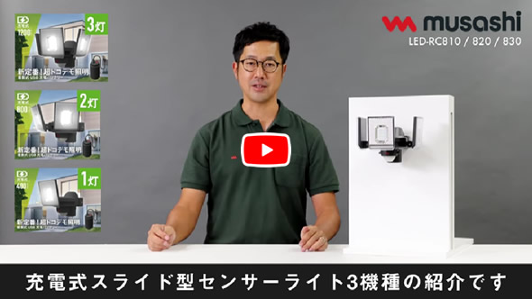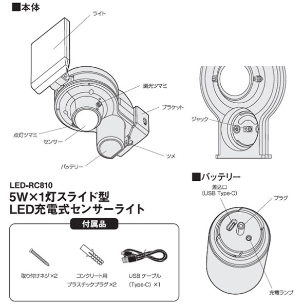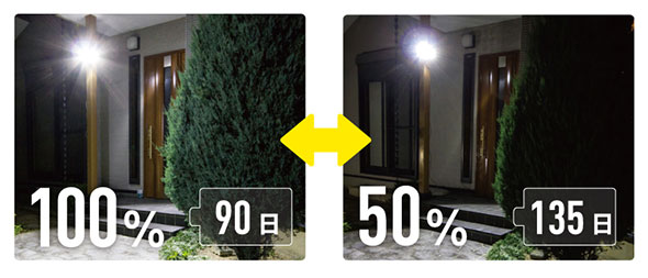![]() ![]() ![]() ![]() ライト部がスライド式で照射方向が真下や真横に自由に調節できます。 充電式で繰り返し使えて経済的。煩わしい配線も一切不要です。 ◎着脱式バッテリー バッテリーだけが取り外しできるのでライトを取り外す必要はありません。 USBで充電ができます。 ![]() ◎点灯モード 100%の明るさのパワーモードと50%の明るさのエコモードが選択切替できます。 ライトが点滅するフラッシュ発光モードも搭載しています。 パワーモードは400ルーメンの明るさで90日間点灯、エコモードは200ルーメンの明るさで135日間点灯します。 ※1日10回点灯、満充電時での目安です。 ![]() ◎別売パーツでどこでも取付け 柱、ポール、鉄面、サッシ、フェンスなど別売パーツを使うことであらゆる場所へ設置が可能です。 SP- 5 クランプセット SP- 7 ステンレスバンド SP-10 強力マグネットベース SP-13 サッシ・薄板用ベース SP-14 フェンス挟み込みベース SP-15 クリップベース ![]() ![]() ![]() |