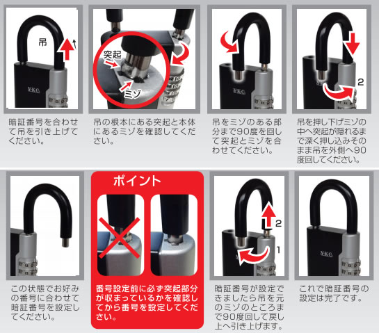 0・0・0・0で開くようセットされています。暗証番号を変更する場合は以下の手順に従い操作してください。