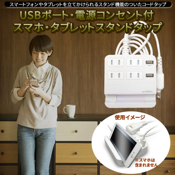 | スマートフォンやタブレットを立てかけられるスタンド機能の付いた電源コードタップ「USBポート・電源コンセント付スマホ・タブレットスタンドタップ M4244」です。通常のUSBポート付コンセントやスマホスタンド単体等はよくありますが、この商品はUSBポートが2個口、電源タップが4個口、さらに便利なスマートフォン、タブレット(大きさや重量によっては立てかけられない場合もあります)が立てかけられるスタンド付の商品ですのでこれ1個あれば、スマホ、充電器等1ヵ所で収まりよく使用できます。スタンド保持部分は特殊加工が施され、機器の角度も自由に調整可能です。又、電源コンセント部分には安全に配慮してホコリの侵入を防ぐシャッター付となっています。 |