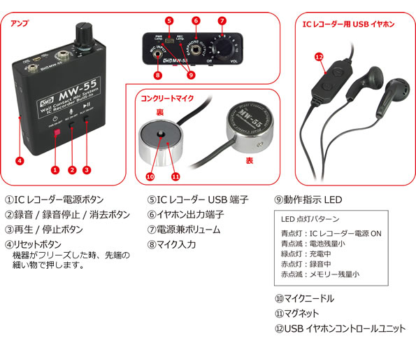 ■乾電池の交換が不要 充電式バッテリーのコンクリートマイクです。煩わしかった乾電池の交換が不要になりました。 連続11時間の録音が可能。録音機能を使用せずにコンクリートマイク機能のみを使用した場合には90時間程作動します。 ■待望の録音機能を搭載 コンクリートマイクで聴取した音声を録音するには、別途レコーダーを用意する必要がありましたが、MW-55では従来のアンプと同等のサイズで録音機能が追加されました。よりコンパクトで、便利にご使用いただけます。 ※MW-55 はコンタクトマイクから入力された音声のみ録音します。尚、録音レベルは一定です。 ■USB端子の提供 パソコンに繋がるUSB端子を搭載しました。大切な録音データをパソコンにバックアップすることができます。 ※データの管理について※ MW-55で記録した音声データファイルには日付情報が入りません。簡易的に録音して聴くことを目的としていますが、仮にデータをパソコン等に保存する場合は、ファイルに名称をつけて管理を行ってください。 ■PCがなくても再生・削除が可能 ![]() ■操作性の向上 ICレコーダーには動作指示LEDとバイブレーションを組込みました。本体を目視せず、手元の感覚で操作することが可能です。 |