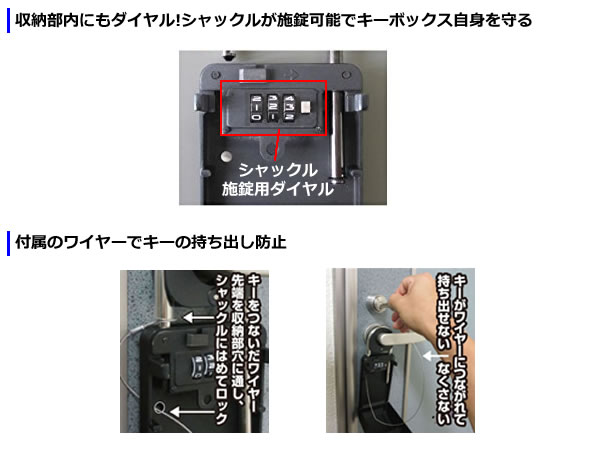 | 本商品の特長は、本体の施錠・解錠を行うダイヤル(4桁)以外にも、シャックルを施錠・解錠を行う事が出来るダイヤル(3桁)が内蔵しており、キ―ボックス自身の盗難防止の機能が付いた所です。又、付属のワイヤーを使用する事で鍵の持ち出しが出来なくなり、鍵の盗難・不正複製等の犯行を防止する機能もございます。今迄にないタイプのダイヤル式キーボックスで『物件管理業務上での新しいキー管理』をご提案出来る商品と考えます。 収納力も大容量で、レバ―ハンドル用のアダプターを標準装備しております。 (※防水加工はしておりません) ![]() ![]() ![]() ●鍵やカードをまとめて収納。大容量で十分な収納ケースです。 ![]() |