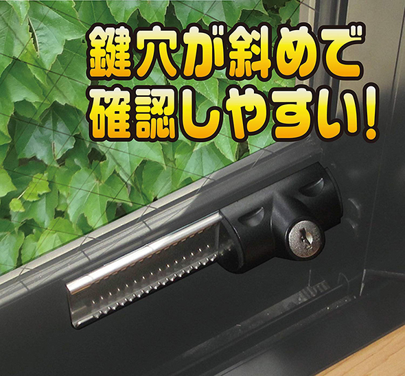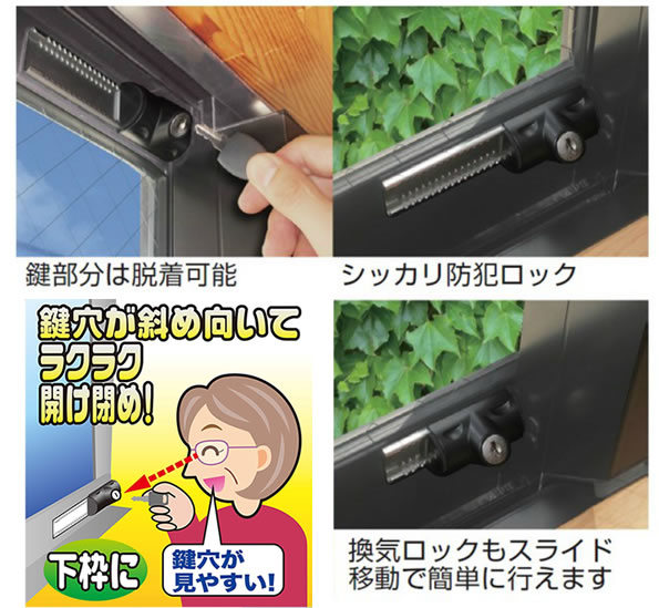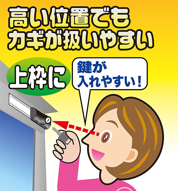 サッシ枠上部・下部どちかに取り付けても鍵穴が斜めに形成されているので鍵穴の位置がわかりやすく、鍵を入れて回すのに大変便利。