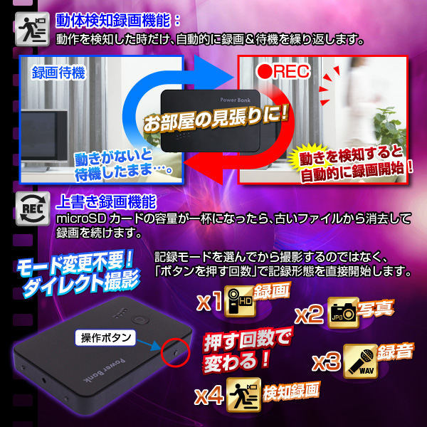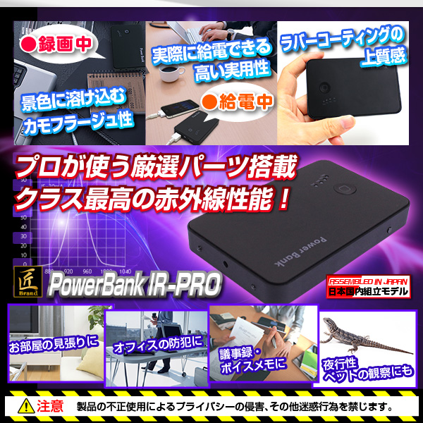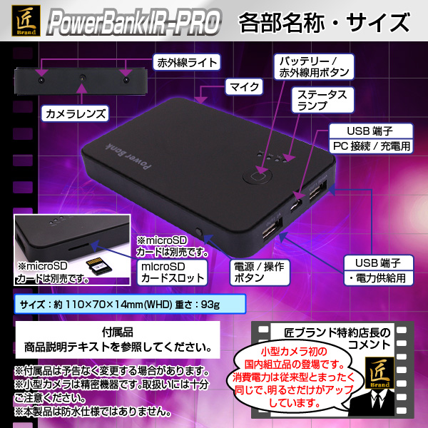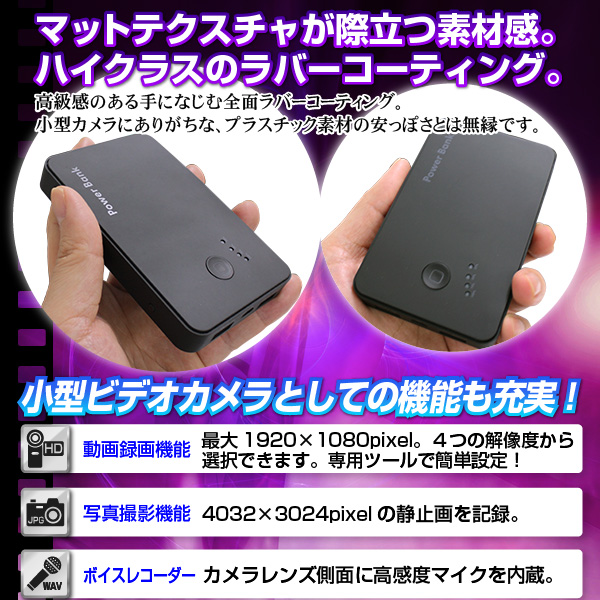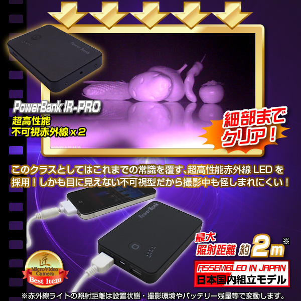 【特徴】![]() 光学技術者が監修した厳選パーツを搭載。従来の2灯赤外線ライト搭載品と比べると 段違いの高性能。しかも目に見えない不可視タイプだから撮影中も怪しまれにくい! ●マットなのに滑らか。手になじむ上質感。 指紋汚れが目立ちにくい、ラバーコーティングされたマットな質感。 小型カメラにありがちな、プラスチック丸出しの安っぽさがありません。 ●給電機能付きモバイル充電器型ビデオカメラ 大容量2000mAhバッテリー搭載。デザインだけでなく、実際にスマホや小型カメラが充電できます。 しかも2台同時に給電できます。 (※簡易給電となります。詳細は注意文をお読みください) ●側面にメモリカードスロット搭載 micro SDカードスロットが側面にあるので、交換が簡単! 指先で押してセット、再度押してイジェクト。これだけです! 他社類似品のように「背面パネルをはがしてから、基板に張り付いているマウンターにメモリカードをセットする」面倒な手間は一切ありません。 ●選べる4つの動画解像度 匠ブランドサポートサイトより設定ツールをダウンロードして 1080pフルハイビジョンサイズから、240p旧式携帯電話サイズまで4つの解像度を簡単に設定できます。 ●Windows 8 動作対応 Windows8(32/64bit)で動作確認済です。 ![]() 【製品機能】 ・動画撮影 ・動体検知録画 ・ボイスレコーダー ・静止画撮影 ・簡易給電 ・赤外線ライト(不可視) ![]() ![]() ![]() ![]() ![]() ![]() ![]() ![]() |