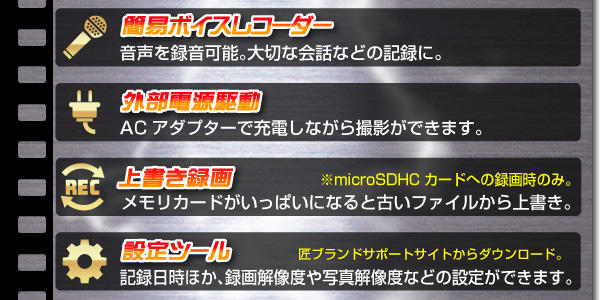 ※本製品で使うmicroSDHCカードはClass10規格をお勧めします。Class4も使えますが、記録した動画がコマ落ちする場合があります。