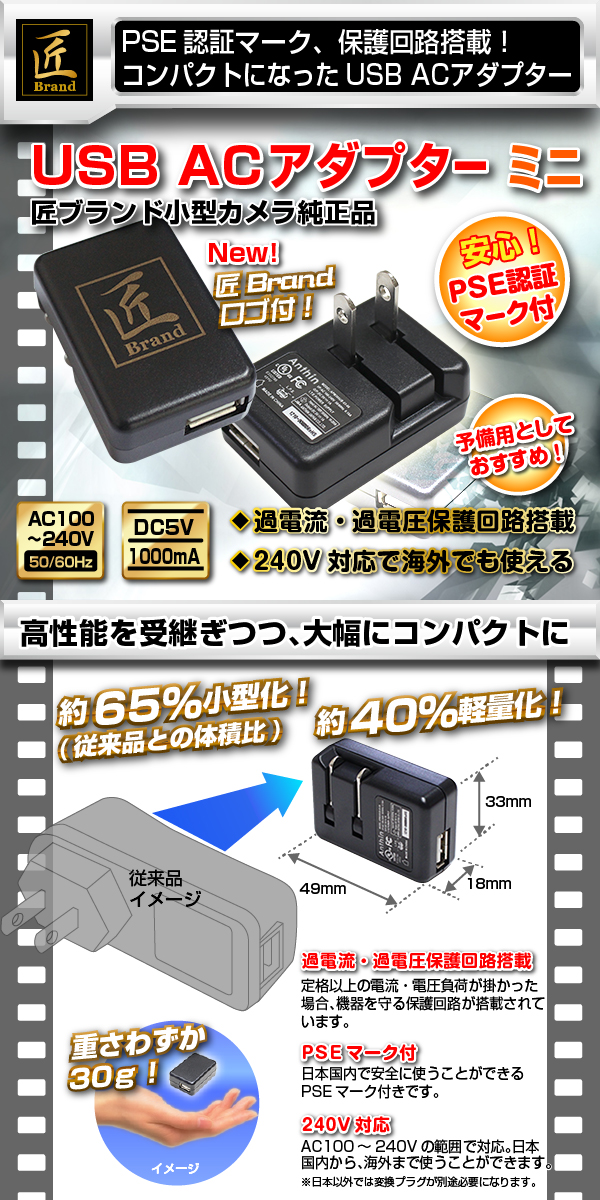[商品説明] ![]() USB ACアダプターミニ5V1000mA(匠ブランド)小型カメラ用 ◎大幅にコンパクトになった匠ブランドの小型カメラ純正品USB ACアダプター。 ◎匠ブランドロゴ付き! ◎TAKUMI-ZEROシリーズでもお使いいただけます。 ◎日本国内で安心して使えるPSE認証マーク付き。 ◎過電流・過電圧保護回路搭載。 ◎AC240V対応で海外でも使える。※海外ご使用時の変換コネクターは別途必要になります。 ![]() [特徴] ●過電流・過電圧保護回路搭載 定格以上の電流・電圧負荷が掛かった場合、機器を守る保護回路が搭載されています。 ●PSEマーク付き 日本国内で安全に使うことができるPSEマーク付きです。 ●240V対応 AC100~240Vの範囲で対応。日本国内から、海外まで使うことができます。 ※日本以外では変換プラグが別途必要になります。 |