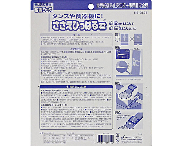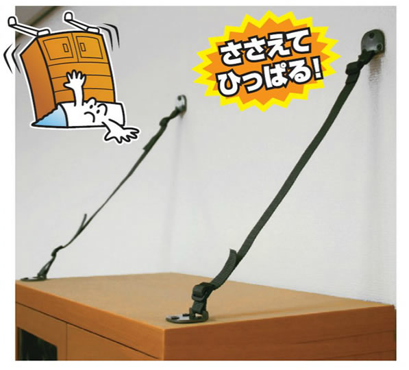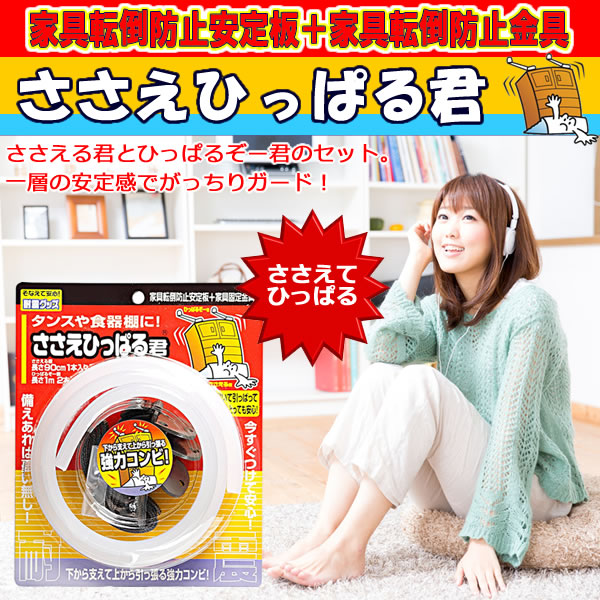 家具転倒防止安定板「ささえる君」と家具転倒防止金具「ひっぱるぞー君」のセット商品家具転倒防止安定板+家具転倒防止金具「ささえひっぱる君」です。文字通りささえてひっぱる!家具を下から支え、上からひっぱる強力コンビ!大地震等から家族を守る家具転倒防止グッズです。家具の前面下部にささえる君を差し込むことで重心を後ろ壁面側に移し倒れにくくする。家具上部は固定具で壁側に引っ張り、転倒を防止。ささえる君は半透明なので目立たず、家の景観を損ねません。ひっぱる君の長さは家具に合わせて調節可能です。