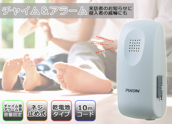 来訪者のお知らせに!防犯用に侵入者の威嚇等にも工夫次第で用途はいろいろ!センサーライトの点灯と同時にチャイム音とアラーム音のどちらかを鳴らすことができるようになります。センサーライトとはコードで直接接続となります。(PZ-815、PZ-820、等対応機種は多数あります。)