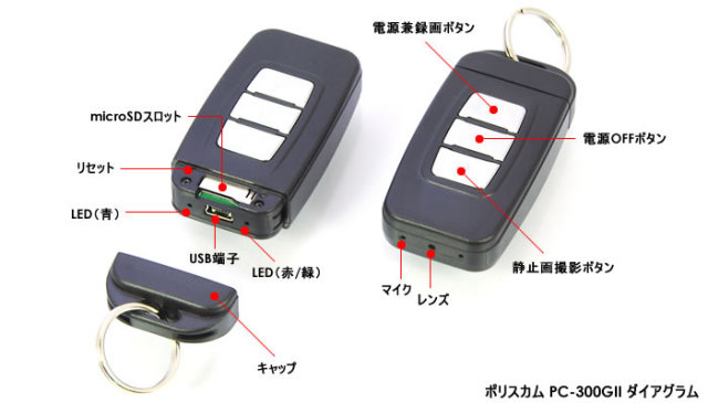 ![]() ●さりげない撮影が可能なリモコンキーのカモフラージュ型 ポリスカム PC-300G2は、外観をリモコンキーに擬装したカメラ一体型レコーダーです。従来機と比べ、より車両のキーレスエントリーらしい外観になりました。 どこにでも持ち歩ける違和感のないデザインで、証拠撮影に最適です。 ●高画質500万画素CMOS/H.264コーデック採用 内蔵カメラはOmniVision製500万画素CMOSを搭載、映像コーデックはAVC/H.264を採用し、従来の超小型ビデオカメラよりさらに高画質撮影を行うことができます。 ●1080pの高画質設計 解像度1080pのFHD高精細仕様を纏って生まれ変わったPC-300G?。発売以来調査・捜査の現場から支持され選ばれ続けてきたPC-300G。満を持したPC-300G?は、後継モデルとして相応しいスペックとなっています。調査・捜査の現場にて価値ある選択の一つとして自信を持ってご提案いたします。 動画記録解像度は、アスペクト比16:9のFull HD動画が撮影できる1080pモード(30fps)、720pモード(30fps)から選択できます。 ※動画は10分ごとに1つのファイルとして作成されます。 ●シンプルなデザインと操作性 シリーズの要であるシンプルなデザインと操作性能。信頼性のある俊敏なメカ反応と簡易操作性能は健在です。 徹底的に無駄をそぎ落とした操作性で、撮影時迷うことなく使用できます。 ●秀逸なる秘匿性能 PC-300G同様細部にまで拘った機器のデザインがもたらす秘匿性はバツグン。本物のリモコンキーと見まごうばかりの秀逸なフォルムデザインは、およそ特殊情報収集機器とは気付かないでしょう。 ●細部まで描写可能な静止画撮影機能 静止画解像度は2592×1944ピクセルを提供。静止画として証拠スナップした場合でも、高い解像度で細部にわたる情報を余すことなく切り取ります。 ●高音質マイク マイクは高性能なコンデンサー型マイクを採用しています。PCMデジタル録音にてクリアな音声記録が可能です。 ●microSDカードスロット搭載 動画および静止画の記録媒体には、マイクロSDカードを採用しました。メモリ容量は最大16GBに対応しています。 ※電源を入れる前に必ずMicroSDカードを挿入してください。 ●その他 証拠能力を上げる日付をインサートするタイムスタンプ機能、ブラインド操作時必須の作動状態を把握するバイブレーション機能の提供。 |