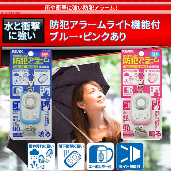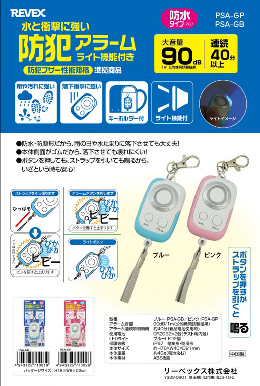 進化している防犯アラーム!雨や衝撃に強い防犯アラームでライト機能付 PSA-GB(ブルー色) PSA-GP(ピンク色)です。防水・防塵形だから、雨の日や水たまりに落下させても大丈夫!本体側面がゴムだから、落下させても壊れにくい!ボタンを押しても、ストラップを引いても鳴るから、いざという時も安心!ライト機能も付いてます!