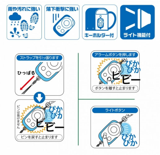 ●ボタンを押しても、ストラップを引いても鳴るから、いざという時も安心!