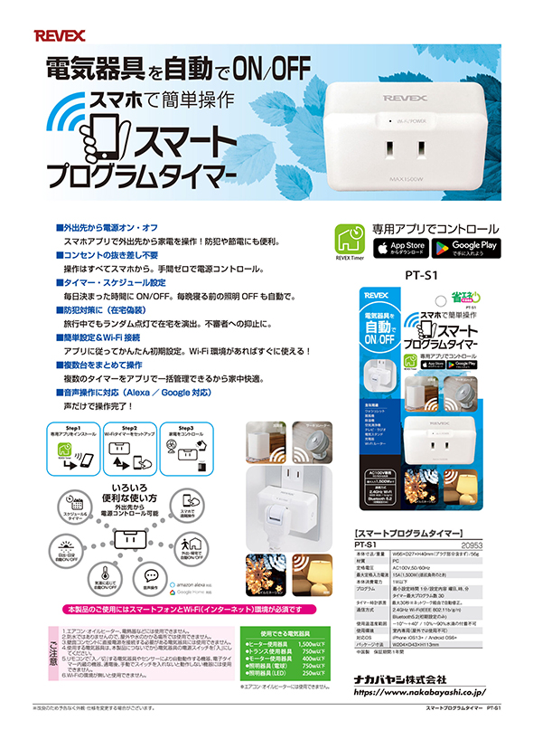 ![]() ![]() ・コンセントの抜き差し不要:操作はすべてスマホから。手間ゼロで電源コントロール。 ・タイマー・スケジュール設定:毎日決まった時間にON/OFF。毎晩寝る前の照明OFF も自動で。 ・防犯対策に(在宅偽装):旅行中でもランダム点灯で在宅を演出。不審者への抑止に。 ・簡単設定&Wi-Fi 接続:アプリに従ってかんたん初期設定。Wi-Fi 環境があればすぐに使える! ・複数台をまとめて操作:複数のタイマーをアプリで一括管理できるから家中快適。 ・音声操作に対応(Alexa / Google 対応):声だけで操作完了! ![]() ![]() 使用できる電気器具 ・ヒーター使用器具:1500W以下 ・トランス使用器具:750W以下 ・モーター使用器具:400W以下 ・照明器具(電球):750W以下 ・照明器具(LED):250W以下 ![]() ![]() |