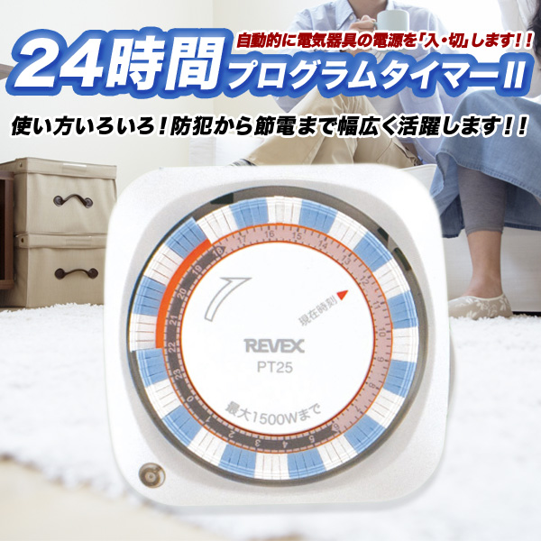 元祖24時間プログラムタイマーPT24のニューバージョン!オーソドックスなアナログタイプに、トラッキング防止プラグや通電確認用LEDランプが付いて新登場! 24時間を15分単位で何回でも毎日自動的に電気器具の電源を「入/切」します。ダイヤル全体が24時間で1回転して押し下げたコマの所で「入/切」します。AC100V専用(50/60Hz切替式)1,500Wまで ※エアコン、クーラーには使用できません