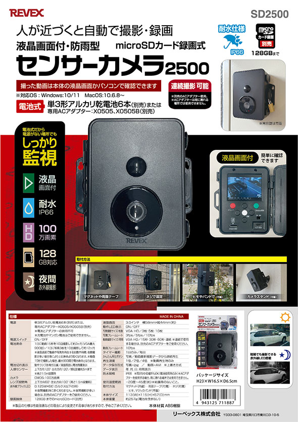 ![]() ![]() ![]() ![]() ![]() ![]() ![]() ![]() ![]() ![]() ![]() ![]() ![]() ![]() ![]() ●特徴 〇 最大100万画素の録画が可能です。 〇 最大128GBまでのmicroSDカードに対応しています。 〇 夜間でも赤外線LEDで録画します。 〇 動画モード・静止画モードを選べます。 〇 連続撮影もできます(タイマー設定時間内)。 〇 撮った画像はパソコンでも確認できます。 〇 屋外でも使用可能です(IP66) 〇 ストーカー対策に 〇 ゴミの不法投棄対策に 〇 侵入者対策に 〇 農作物荒し対策に 〇 車上荒らし対策に |