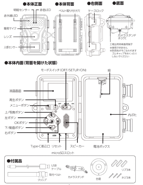 USBケーブル、取付ベルト、カメラスタンド、台座、ネジ3本、リブ3本 |