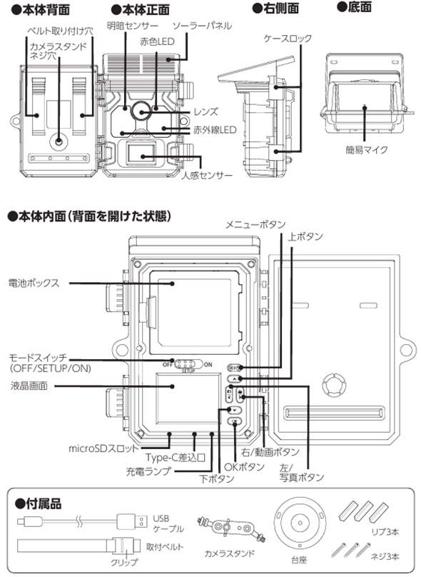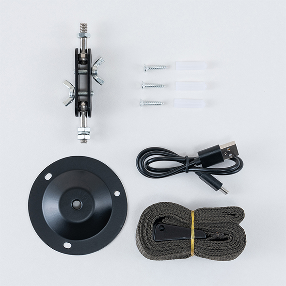 USBケーブル、取付ベルト、カメラスタンド、台座、ネジ3本、リブ3本 |
