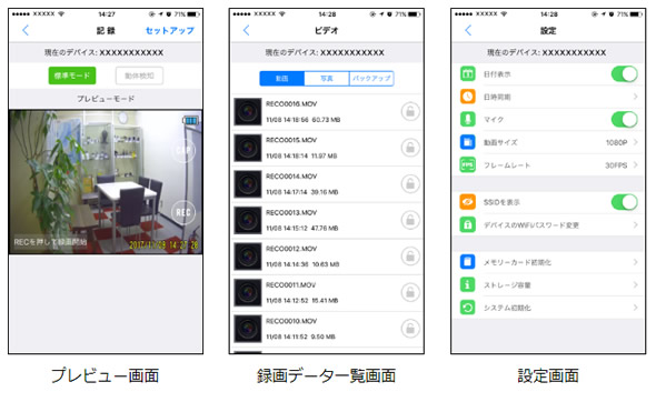 赤LED 点灯 ︓録画中 橙LED 点滅 ︓Wi-Fi 機器探索中 橙LED 点灯 ︓Wi-Fi 接続中 青LED 点滅 ︓充電中(青LED3つが順番に点滅) 青LED 点灯 ︓充電完了(青LED3つ点灯) ■高性能なデジタルビデオカメラ Wi-Fi機能を使用しないときでも、高性能なデジタルビデオカメラとしてもご利用いただけます。 ※再生時にはパソコンが必要となります。 ■安心の上書機能 メモリーカードがフルになっても、古いデータから順に上書していきます。 ■日付インサート機能 日付情報を映像にインサートできるタイムスタンプ機能を提供、映像に撮影日時が残せます。 ※日付設定は専用アプリからも行えます。 |