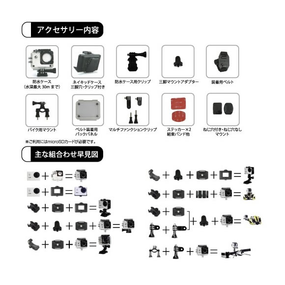 防水ケース、平面用マウント、防水ケース用クリップ、バイク用マウント、マルチファンクションクリップ、装着用ベルト、平面用・曲面用マウント、ネイキッドケース 三脚穴・クリップ付き、ステッカー×2、三脚マウントアダプター、microUSBケーブル、取扱説明書兼保証書 |