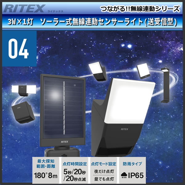 ●ソーラー・1灯タイプ W-630は、ソーラー発電で電源不要です。 カーポートなどコンセントの無い場所に。 ![]() ![]() ![]() ![]() ![]() ![]() ![]() ![]() ![]() ![]() ![]() ●無線連動で一斉点灯 ワイヤレスセンサーライトシリーズ 1か所のセンサーが感知すると設置しているライト複数台を一斉に点灯させることができます。 複数台設置することで、車を車庫に入れる時や帰宅時に広範囲が一気に明るくなります。 一斉点灯による威嚇効果と死角がなくなることで防犯効果を高めます。 ●ワイヤレスの連動設定は簡単シンプル 連動したい製品の4つのスイッチを同じ形に合わせるだけです。 設置しているすべてのワイヤレス製品を同じ形にすればすべての製品が一斉点灯します。スイッチの形を分けることで連動グループを区別することも可能です。 (最大16台16チャンネル) ●さまざまな場所で連動して活躍 ワイヤレスシリーズは、コンセント、乾電池、ソーラータイプがあります。 設置場所に合わせて選べるから家の周りをすべてカバーできます。 光だけでなくチャイム(音)タイプもラインナップ。 光と音がつながることで防犯効果をさらに高め、暮らしを便利にするワイヤレスセンサーライトシリーズ。 |
