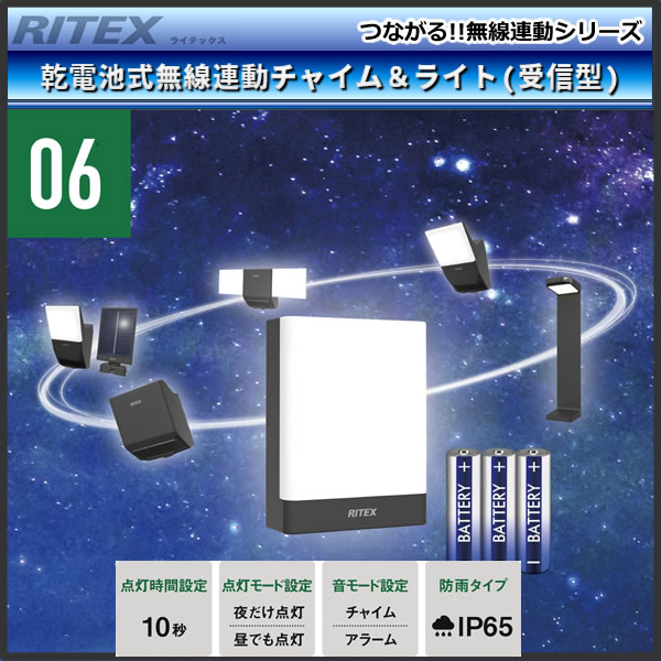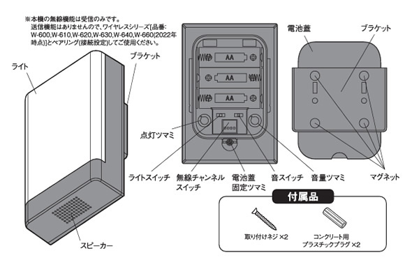 ●乾電池・チャイム&ライト W-650はセンサー無線連動すると光と音で反応します。チャイム音とアラーム音の切替可能です。 乾電池式で設置場所を選びません。 ※W-650は受信専用です。送信機とセットでお使いください。 ![]() ![]() ![]() ![]() ![]() ![]() ![]() ![]() ![]() ![]() ![]() ●無線連動で一斉点灯 ワイヤレスセンサーライトシリーズ 1か所のセンサーが感知すると設置しているライト複数台を一斉に点灯させることができます。 複数台設置することで、車を車庫に入れる時や帰宅時に広範囲が一気に明るくなります。 一斉点灯による威嚇効果と死角がなくなることで防犯効果を高めます。 ●ワイヤレスの連動設定は簡単シンプル 連動したい製品の4つのスイッチを同じ形に合わせるだけです。 設置しているすべてのワイヤレス製品を同じ形にすればすべての製品が一斉点灯します。スイッチの形を分けることで連動グループを区別することも可能です。 (最大16台16チャンネル) ●さまざまな場所で連動して活躍 ワイヤレスシリーズは、コンセント、乾電池、ソーラータイプがあります。 設置場所に合わせて選べるから家の周りをすべてカバーできます。 光だけでなくチャイム(音)タイプもラインナップ。 光と音がつながることで防犯効果をさらに高め、暮らしを便利にするワイヤレスセンサーライトシリーズ。 |
