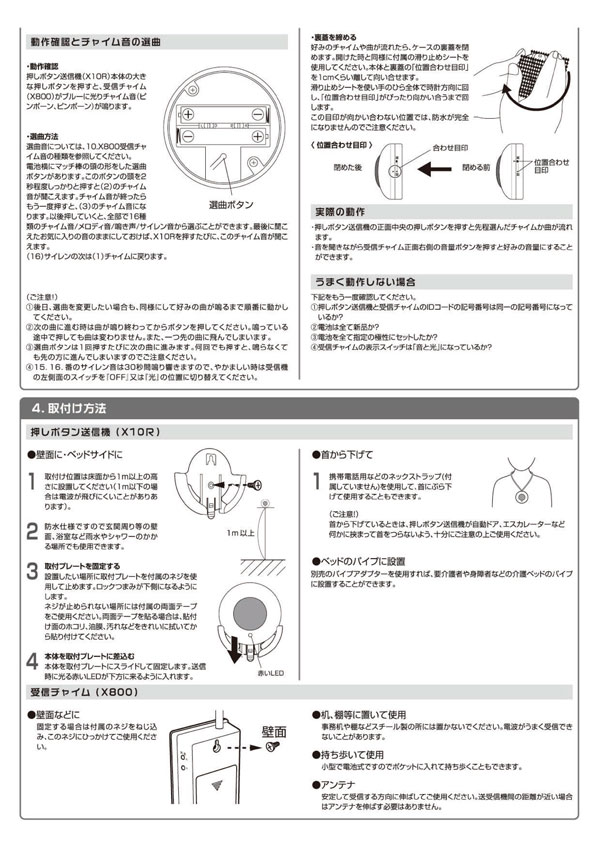 電池の横の丸い選曲ボタンを押し、受信チャイム(X800)で受信モニターしながら選曲 |